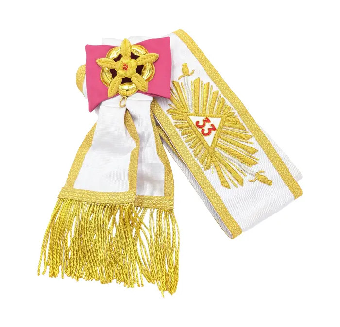 A beautifully crafted Rose Croix 33rd Degree Sash, hand-embroidered with exceptional attention to detail. This sash is made from elegant white moiré watermarked ribbon and adorned with golden braid along the borders, finished with a 4-inch gold bullion fringe for a distinguished and ceremonial look.